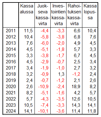 Juokseva kassavirta oli negatiivinen 10,1 miljardia euroa. Kassassa oli vuoden alussa rahaa 14,1 miljardia euroa, joten pelkät kassavarat riittivät kattamaan negatiivisen juoksevan kassavirran.